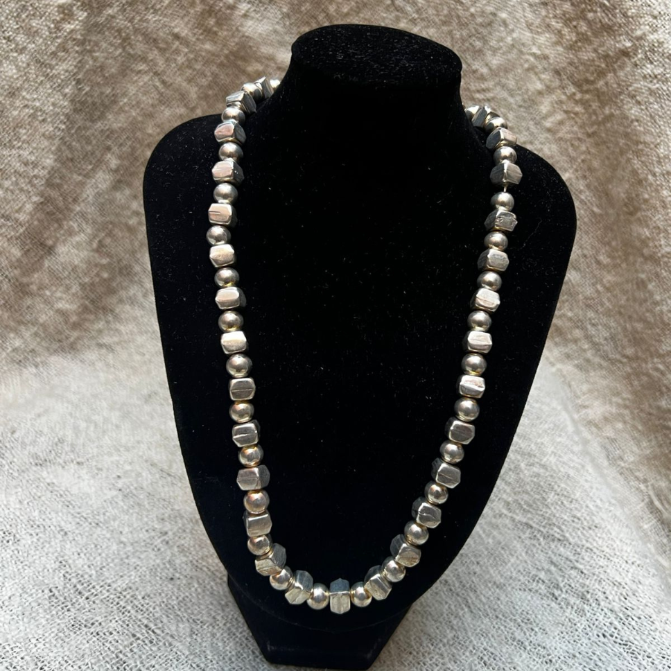 The alternating rounded and faceted silver beads create a subtle rhythm and texture, catching the light with every movement. Its minimalist yet bold design makes it a versatile jewel, perfect for both everyday wear and special occasions.