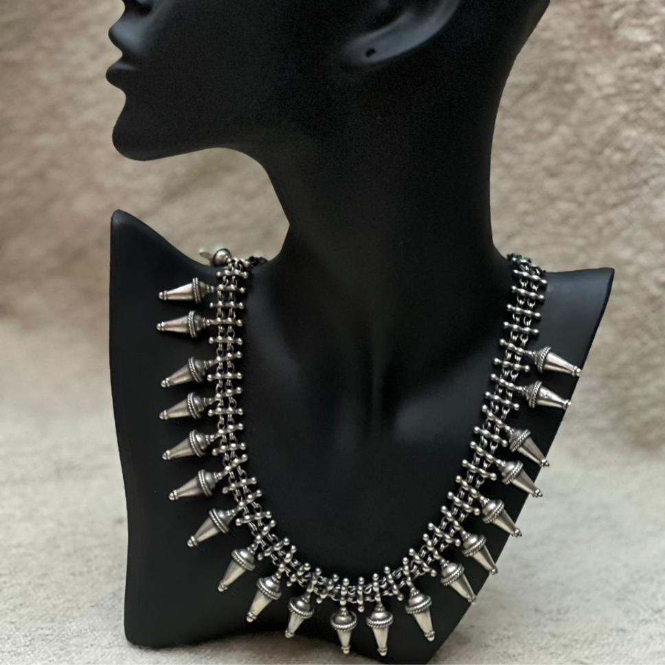 The layered silver links and oxidized finish enhance its antique character, giving the necklace a raw yet refined presence. Designed as a statement piece, it brings depth, authenticity, and cultural richness to both contemporary and traditional outfits.